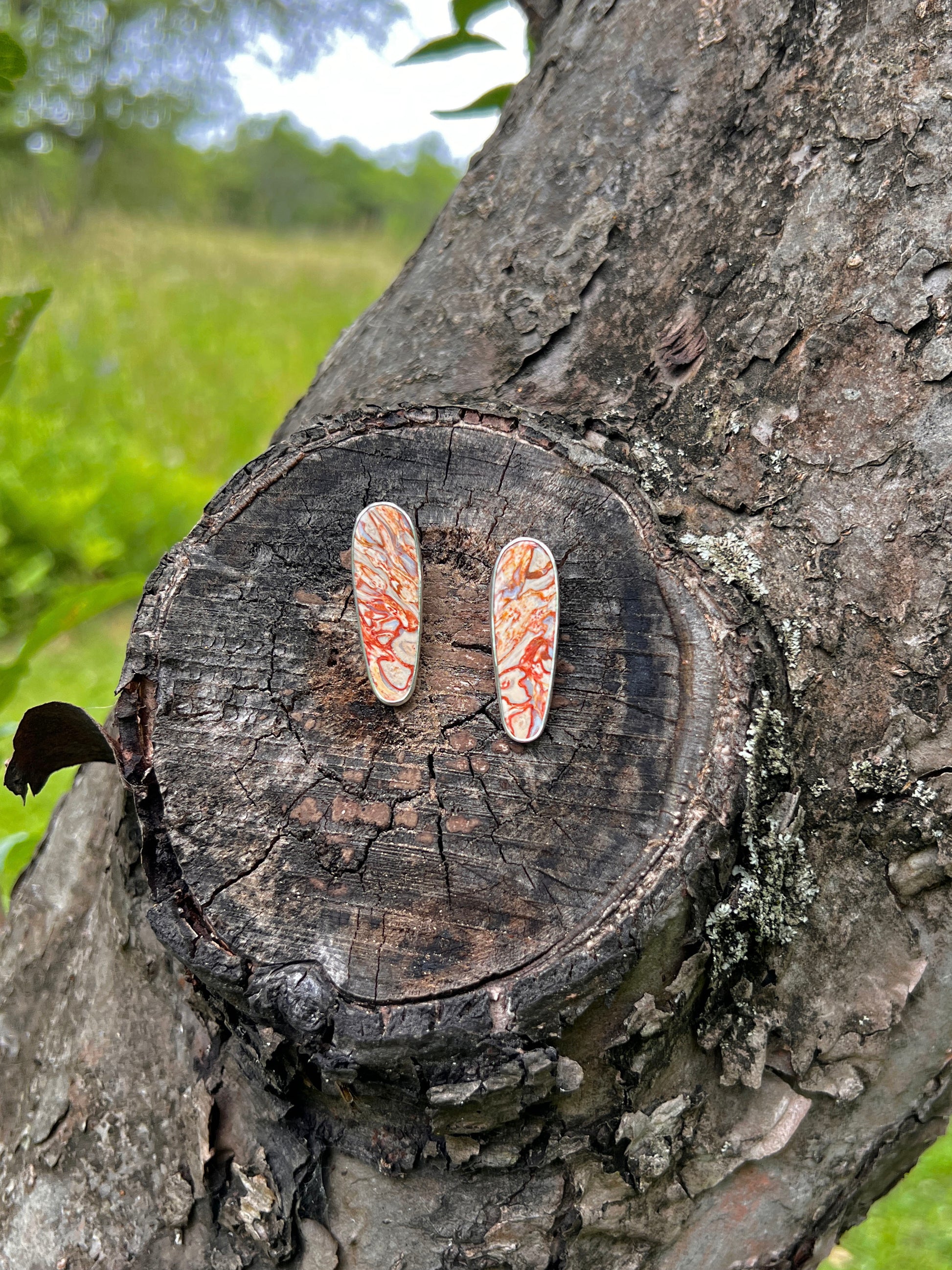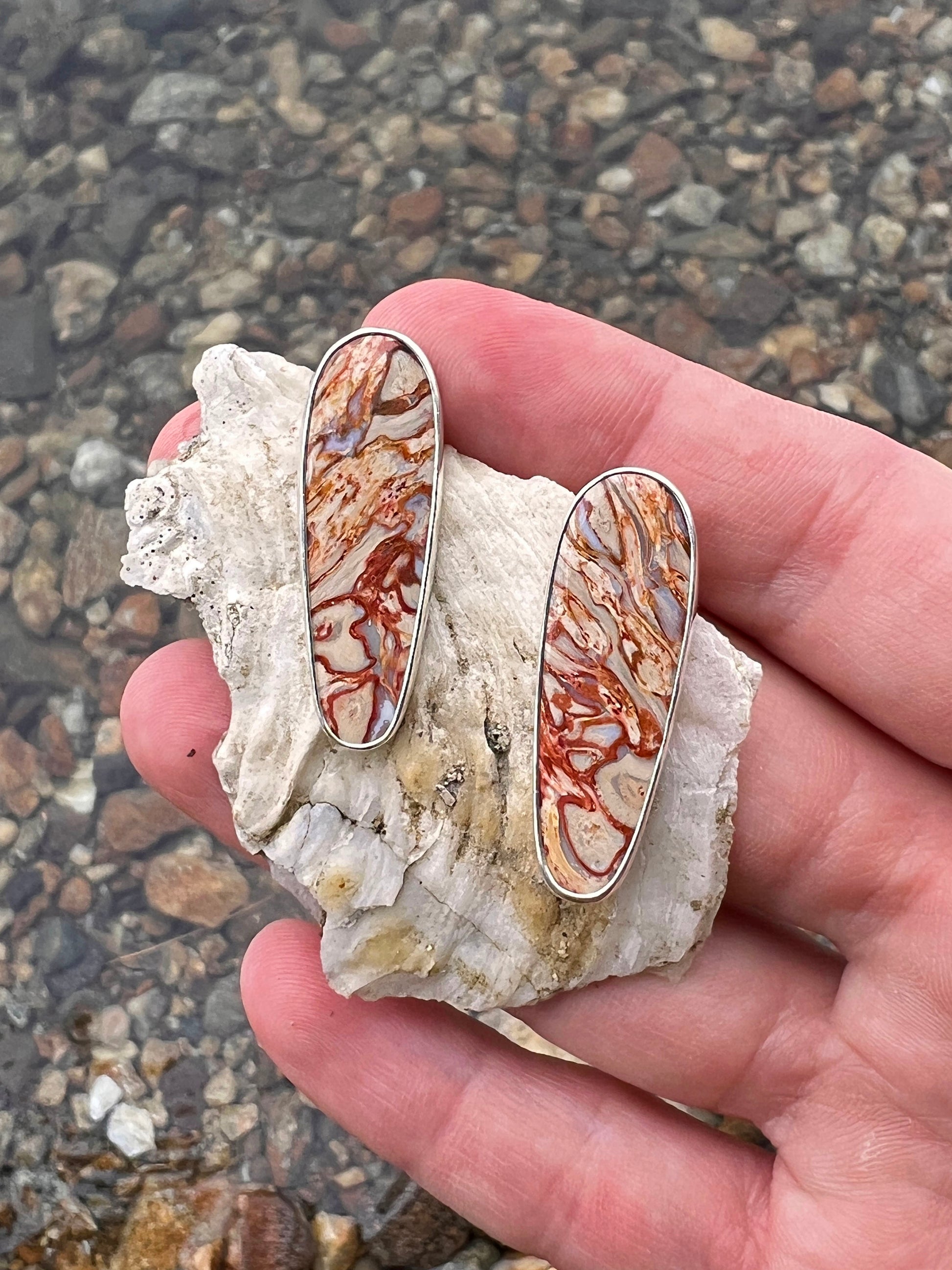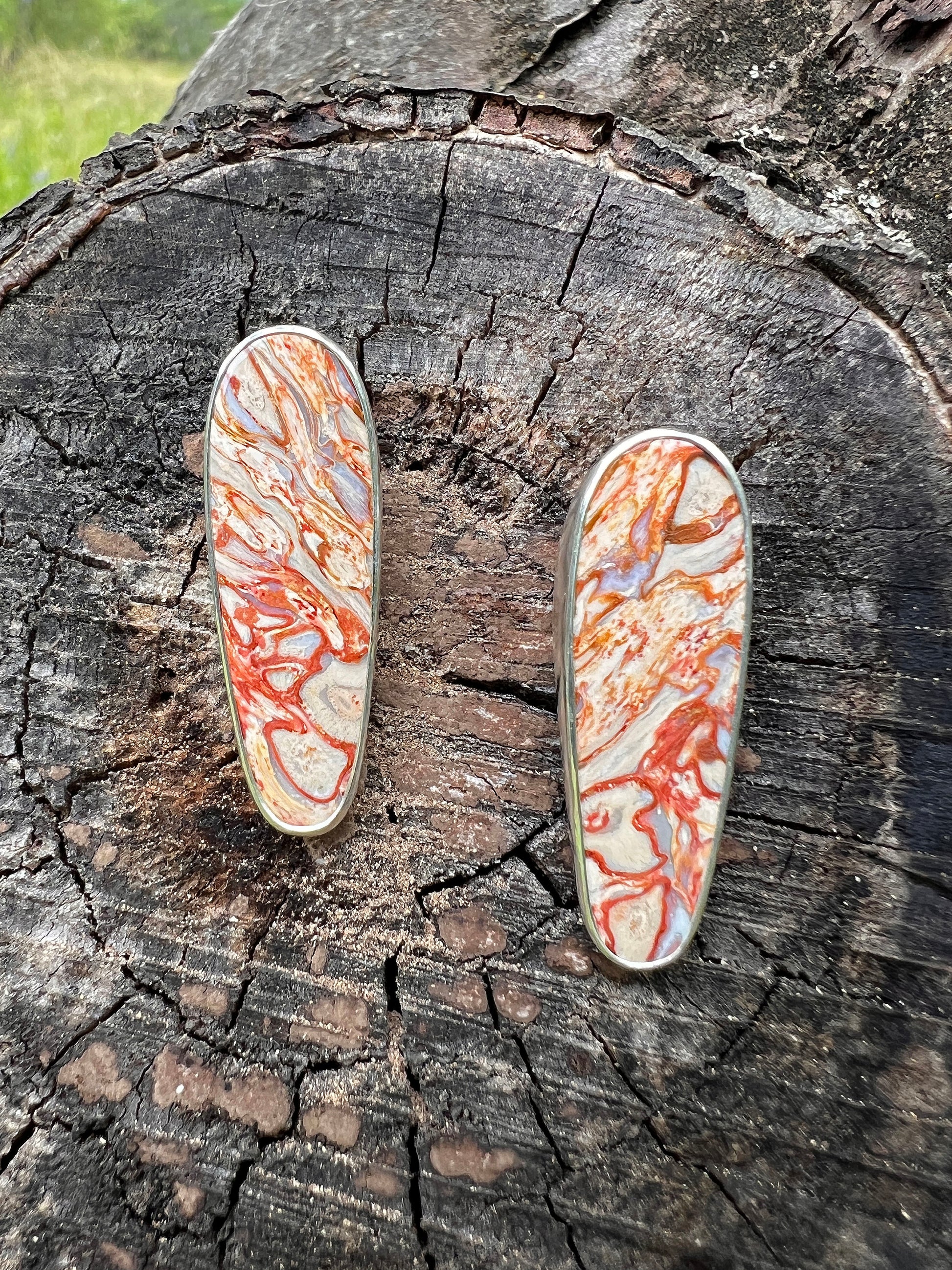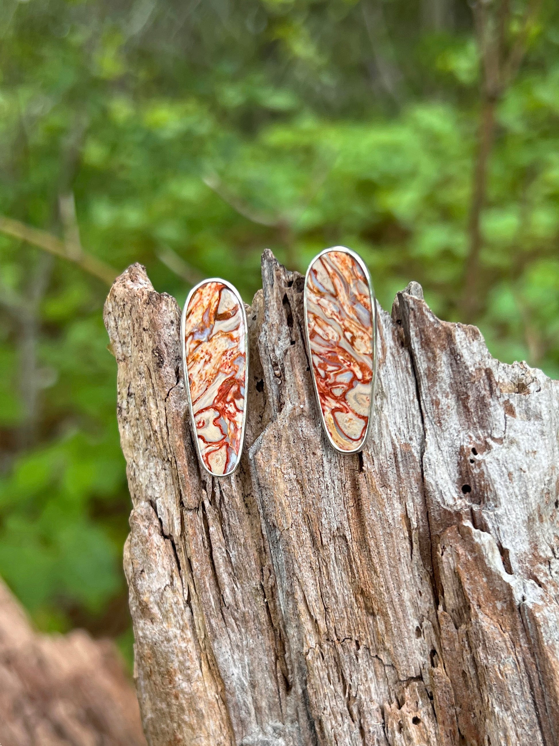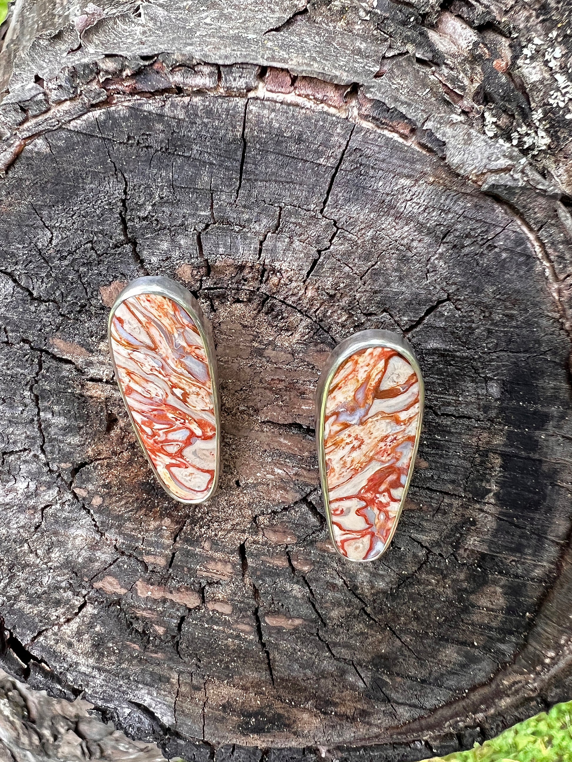 These earrings feature fossilized palm root stones with a stunning pattern. Made from fine and sterling silver.