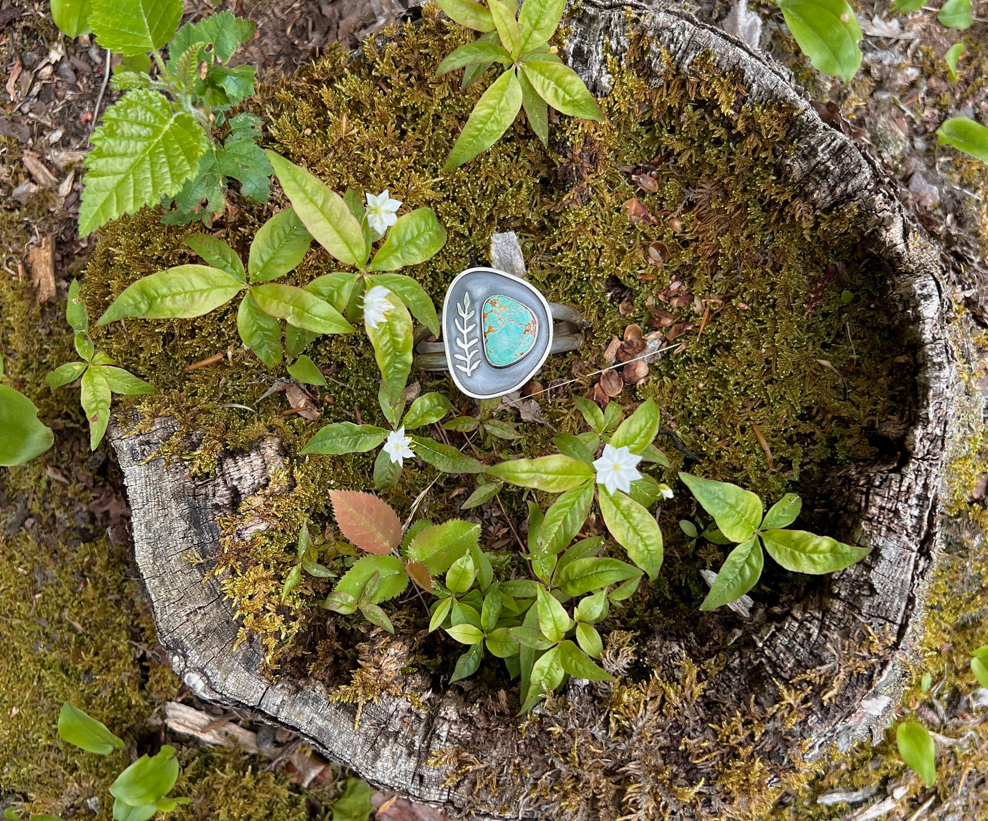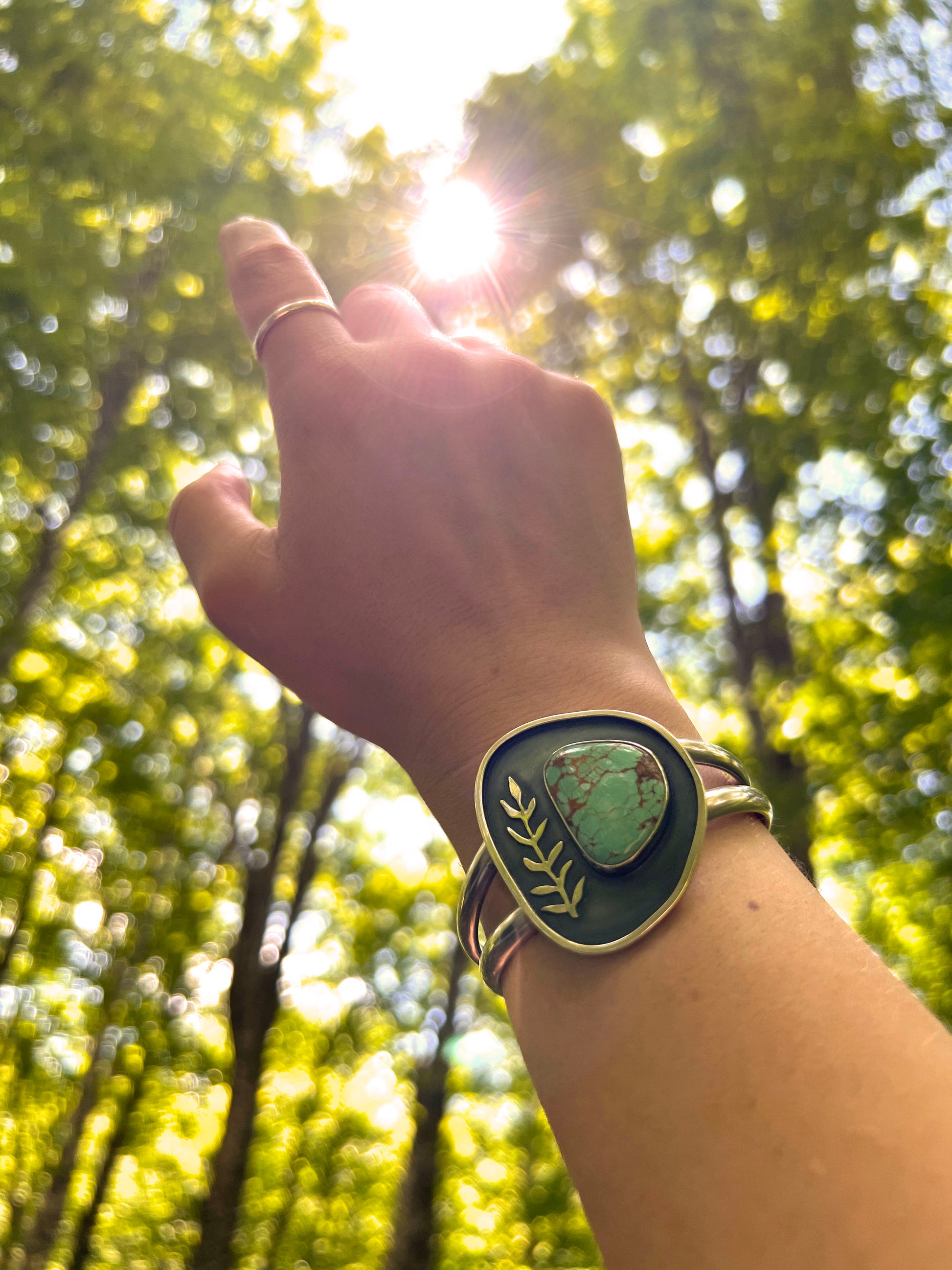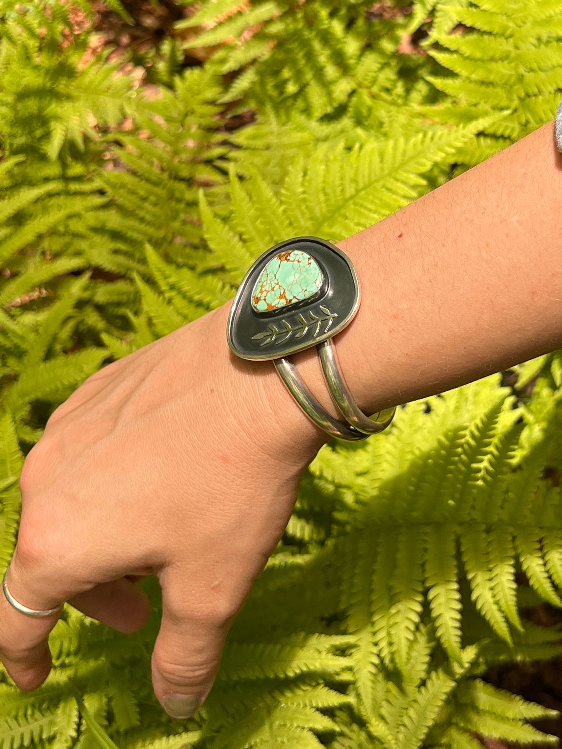 This cuff features a self cut and polished Kingman turquoise stone next to a hand sawn leaf in a show box setting. Made from fine and sterling silver.